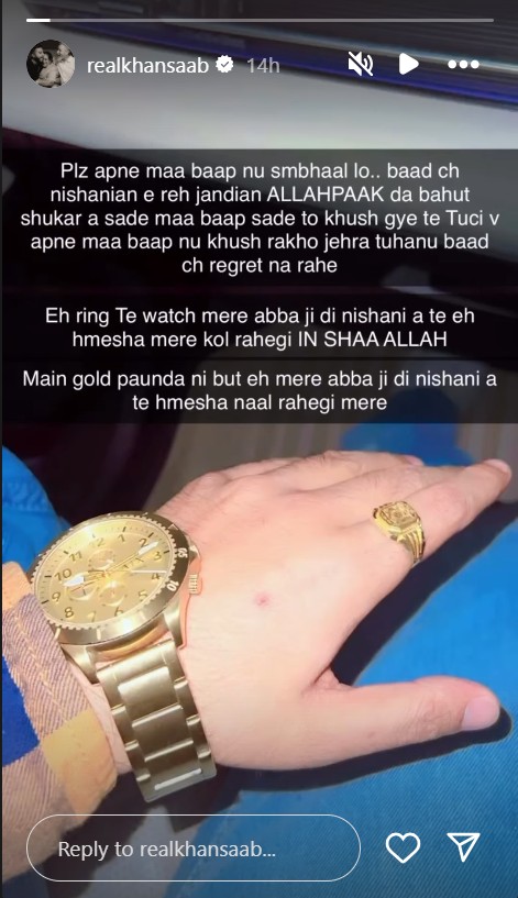 Referring to the gold ring and watch in the picture, Khan Saab shared, “This ring and watch belong to my father — they are his keepsakes and will always stay with me, In Shaa Allah. I don’t usually wear gold, but this is my father’s remembrance, and it will always remain with me.”